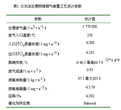 某電廠燃煤煙氣SCR法處理裝置的工藝設(shè)計參數(shù)見表1。該裝置1999年投運至今,運行狀況良好,各項指標完全達到設(shè)計性能要求。
