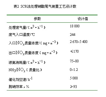 某化工廠用SCR法處理硝酸尾氣裝置的工藝設(shè)計參數(shù)見表2。該裝置1993年投入運行,脫硝效率達到93%以上,凈化尾氣達到排放標準,環(huán)境與社會效益顯著。